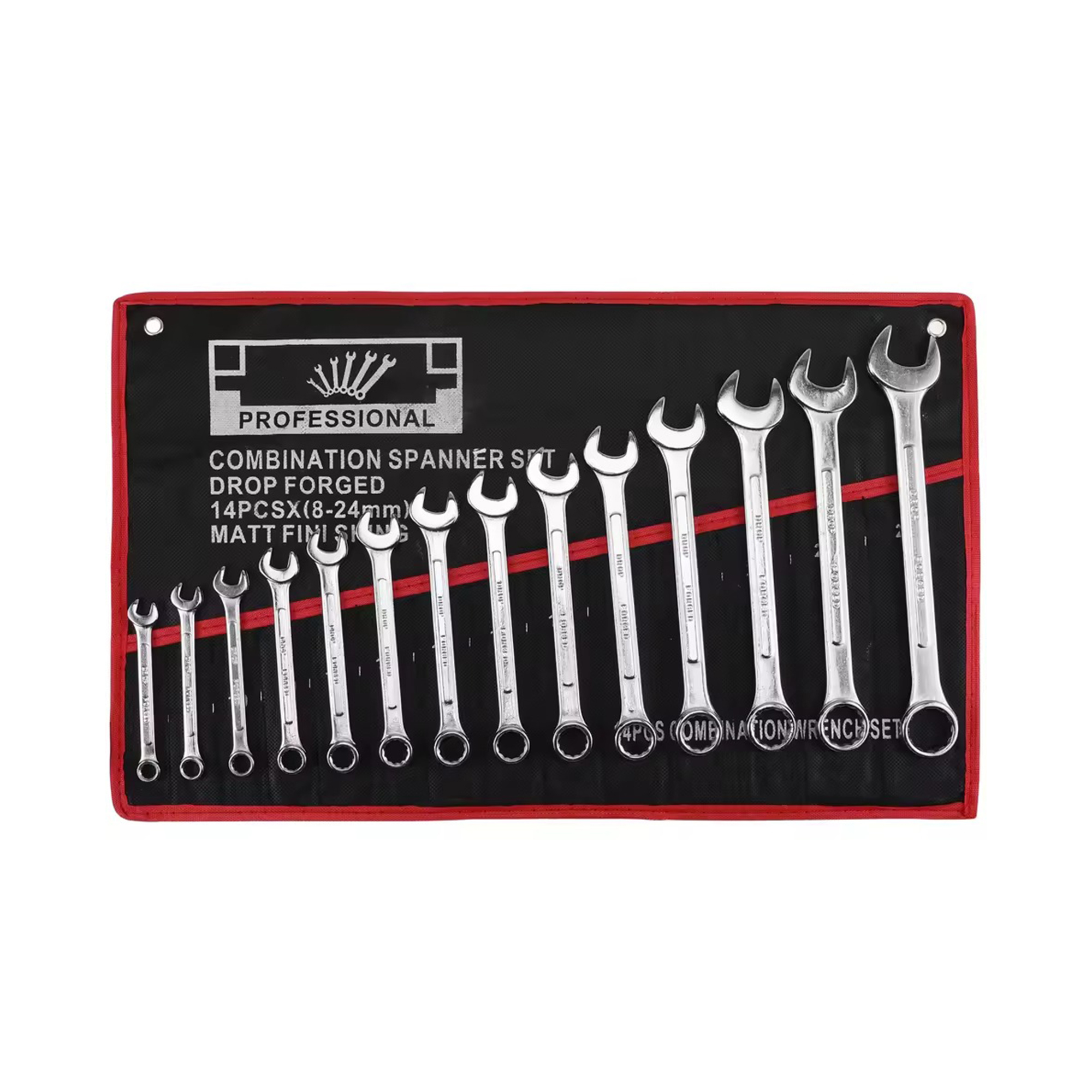 Set profesional çelësash kombinim prej 14 copësh (8–24 mm), i punuar nga çelik i fortë drop forged për qëndrueshmëri dhe rezistencë të lartë. I përshtatshëm për punë mekanike, servise dhe përdorim të përditshëm profesional.