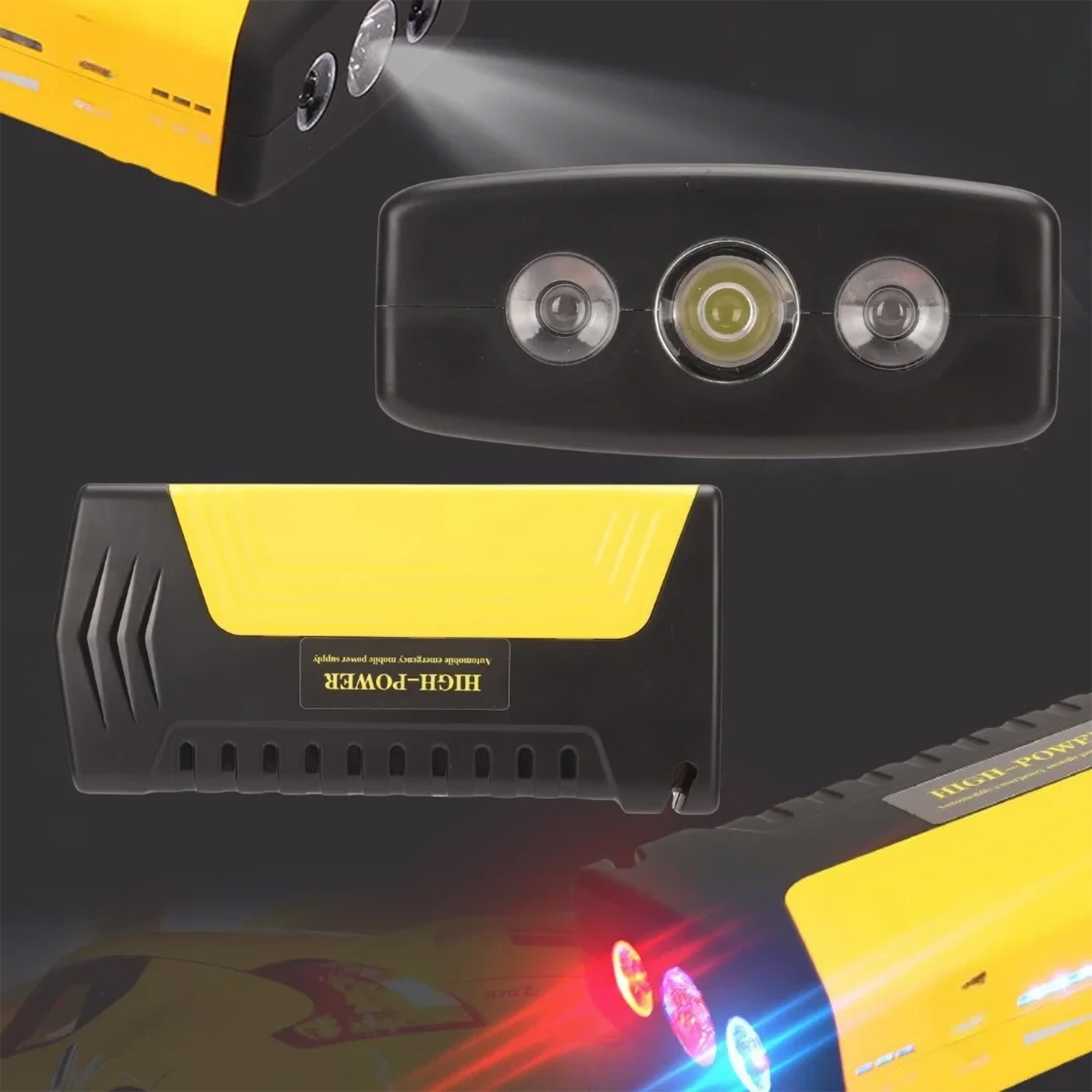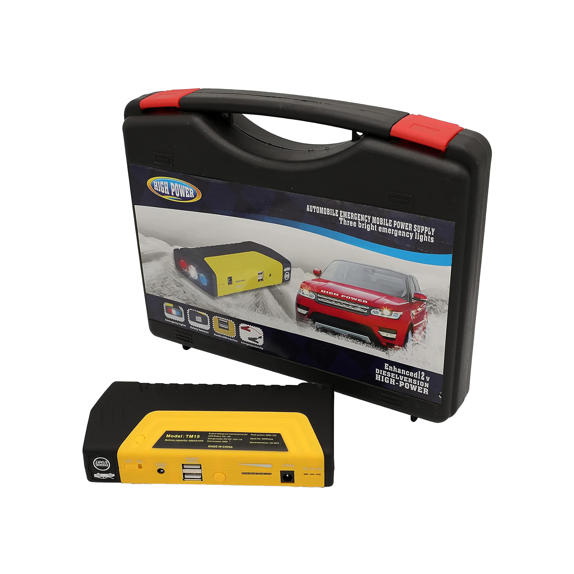 Starter emergjent portativ për ndezjen e veturës, me bateri të integruar, dalje USB dhe ndriçim për përdorim në situata urgjente.